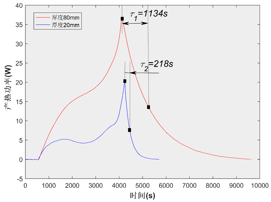 由于厚度不同的电池在容量上难以一致,因此本文选用两款容量不同、大面面积相似、而厚度分别为20mm和80mm的磷酸铁锂电池(#1和#2),进行1C恒流放电实验。理论上放电过程中电池内阻随SOC下降而单调递增,所以放电结束时刻电池产热功率应达到最大值。但等温量热仪测量存在的热滞后效应导致放电结束后热功率曲线需要经过一定时间才能衰减为零。此处定义放电结束后功率从峰值衰减至峰值1/e的时间τ为热滞后时间常数。τ的大小与电池至加热片之间非稳态传热的时间常数相关。如图2所示,对于厚度为80mm的#2电池,τ₁=1134,明显大于#1电池的计算结果(τ₂=218),说明电池厚度增加会显著影响电池产热测量的动态响应,这可能是由于电池热容和内部热阻都与厚度正相关。