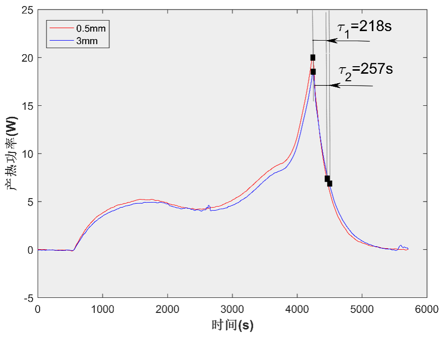 其中φ₀为修正后电池放热功率,φ为仪器实测放热功率,τ为时间常数参数。τ与电池热容以及电池与加热片之间的热阻有关。