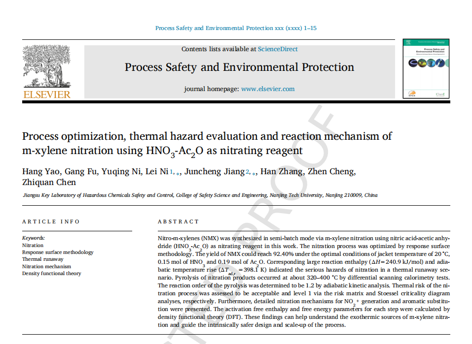 南京工业大学倪磊教授团队在 Process Safety and Environmental Protection 期刊发表题为 Process optimization, thermal hazard evaluation and reaction mechanism of m-xylene nitration using HNO3-Ac2O as nitrating reagent 论文,该成果国家自然科学基金项目(No. 21927815, 52334006, 52274209)等支持