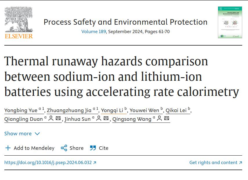 中国科学技术大学王青松教授团队在Process Safety and Environmental Protection(IF:6.9)发表题为Thermal runaway hazards comparison between sodium-ion and lithium-ion batteries using accelerating rate calorimetry论文,该成果由中国科学技术大学火灾科学国家重点实验室和中国南方电网发电有限公司储能研究所等机构联合支持。