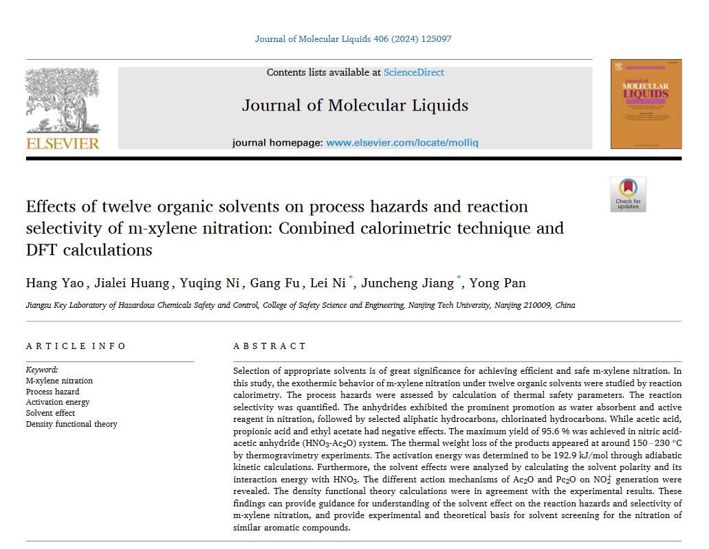 南京工业大学倪磊教授团队在Journal of Molecular Liquids期刊发表论文《Effects of twelve organic solvents on process hazards and reaction selectivity of m-xylene nitration: Combined calorimetric technique and DFT calculations》,该成果由国家自然科学基金项目(No. 21927815, 52334006, 52274209)等支持。