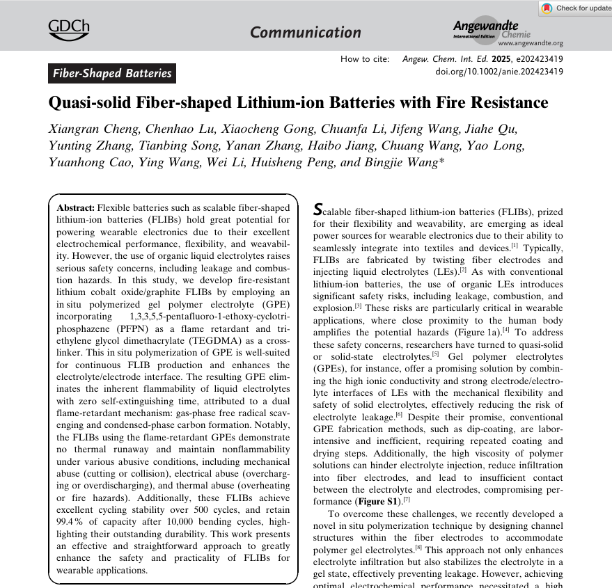 本研究运用仰仪科技的小型电池绝热量热仪BAC-90A,针对复旦大学王兵杰团队研发的新型纤维聚合物锂离子电池开展热失控测试,深入剖析了该纤维电池的热安全性。相关研究成果《Quasi - solid Fiber - shaped Lithium - ion Batteries with Fire Resistance》已发表于《Angewandte Chemie》期刊,为该电池在智能可穿戴设备等领域的应用夯实了理论基础。