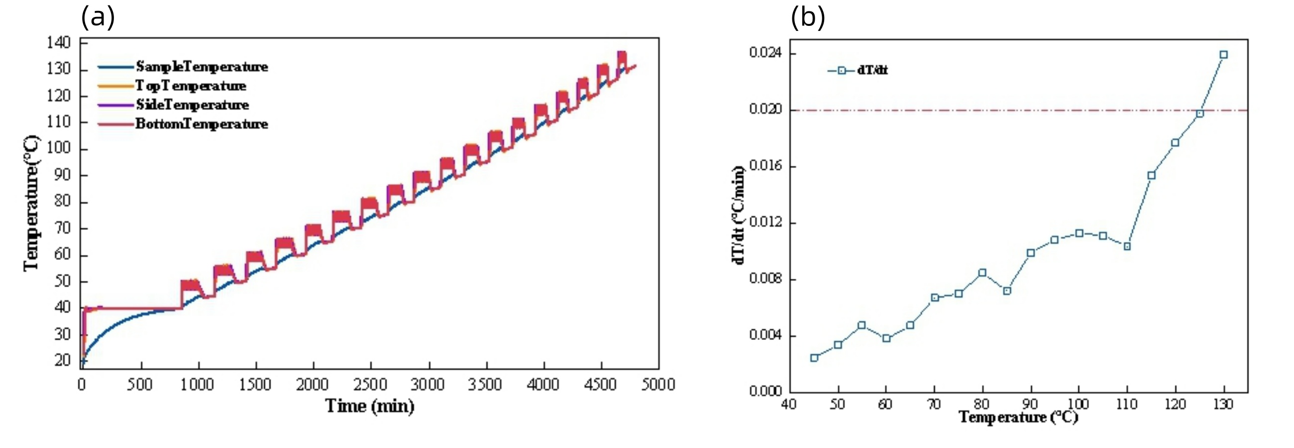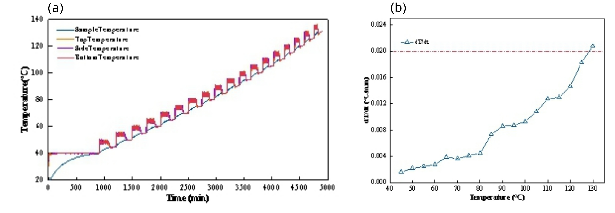 图3 #01电池绝热温升特性试验(a)电池升温曲线和(b)温升速率-温度曲线