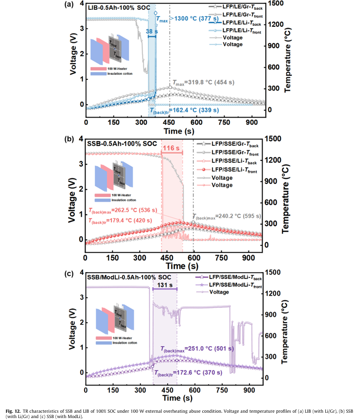 结果表明,在绝热加热热失控实验中,固态锂金属电池(SSB)的自发热起始温度相比液态电池(LIB)滞后超过30℃,热失控出发温度也随之提升。并且最高温度以及最高温升速率的降低也证实了固态锂金属电池(SSB)较低的热失控危害性。