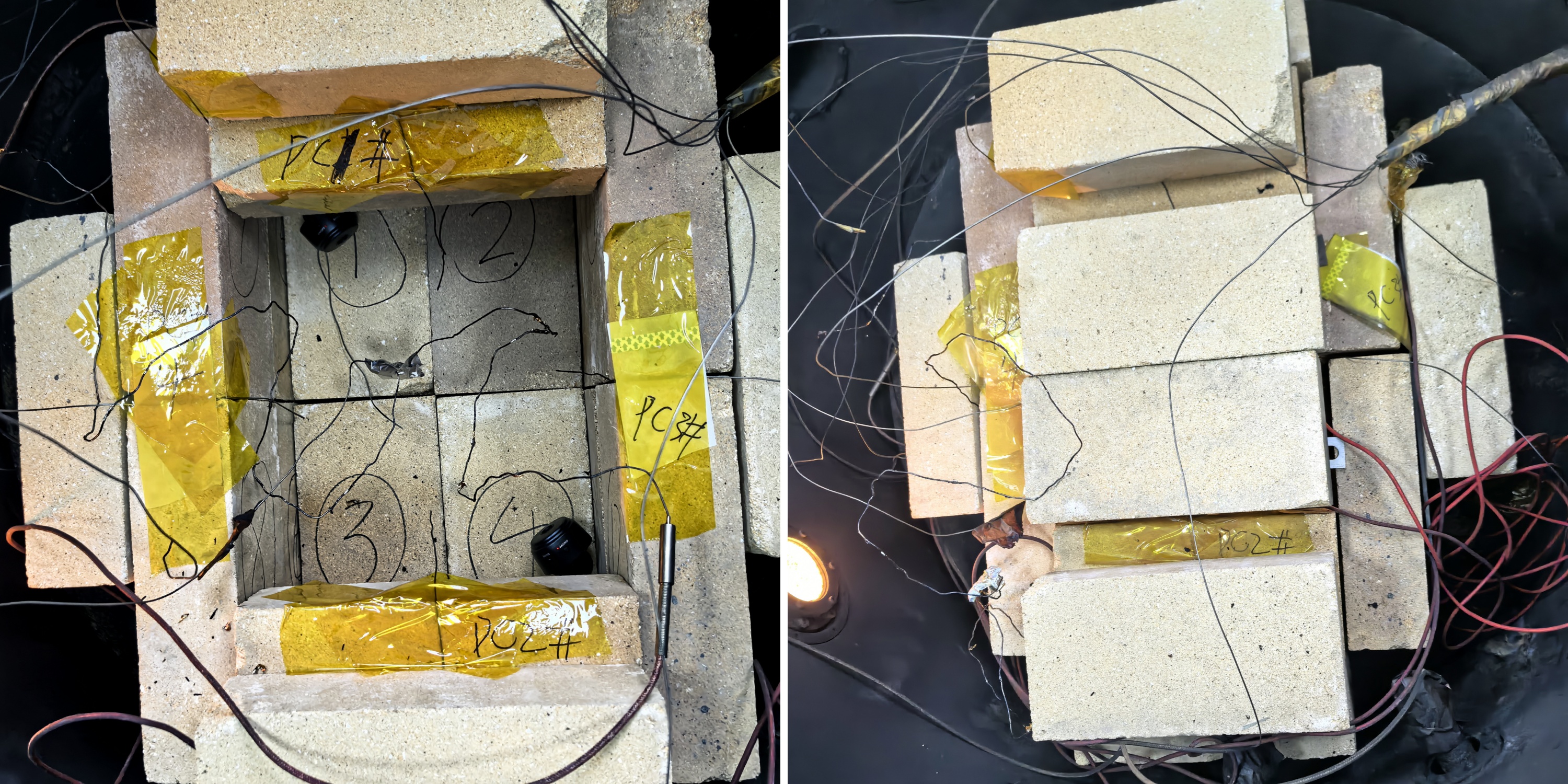 在实验过程中,砖块将会如图3所示进行固定,保证砖块将电池完全包裹,从而全面的评价电池爆炸的危害。并在内部加装了摄像头与热电偶进行监测。