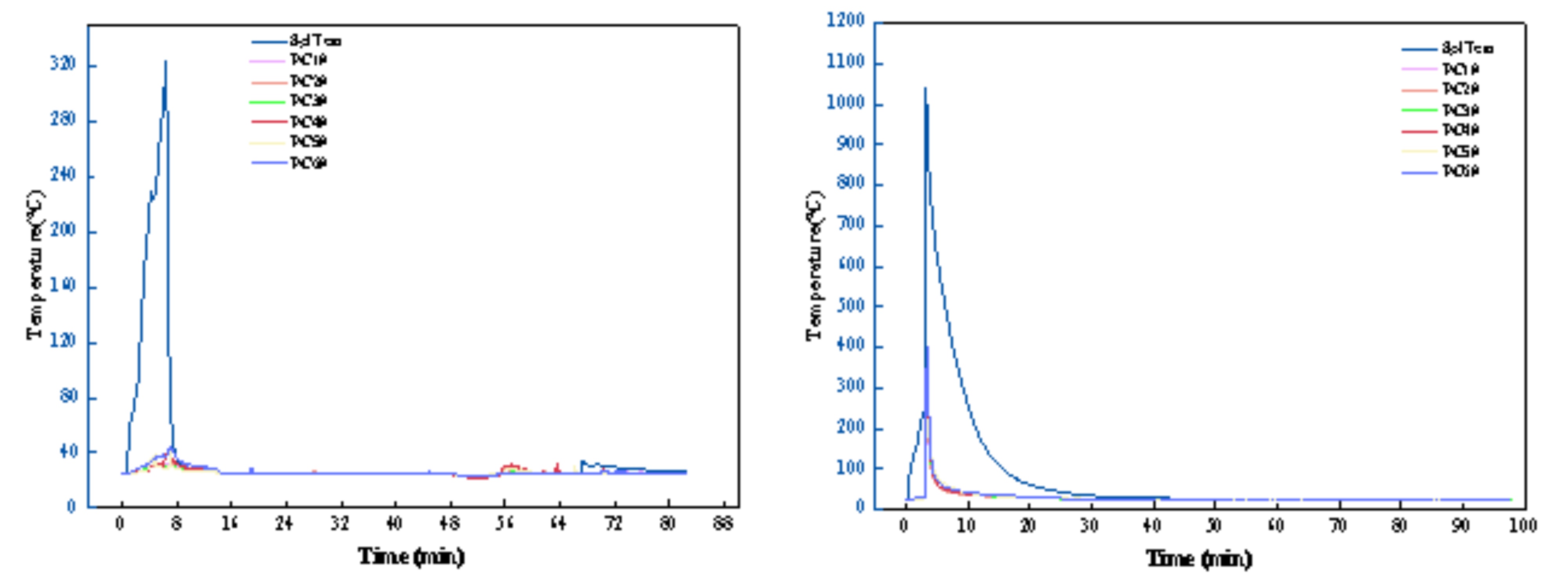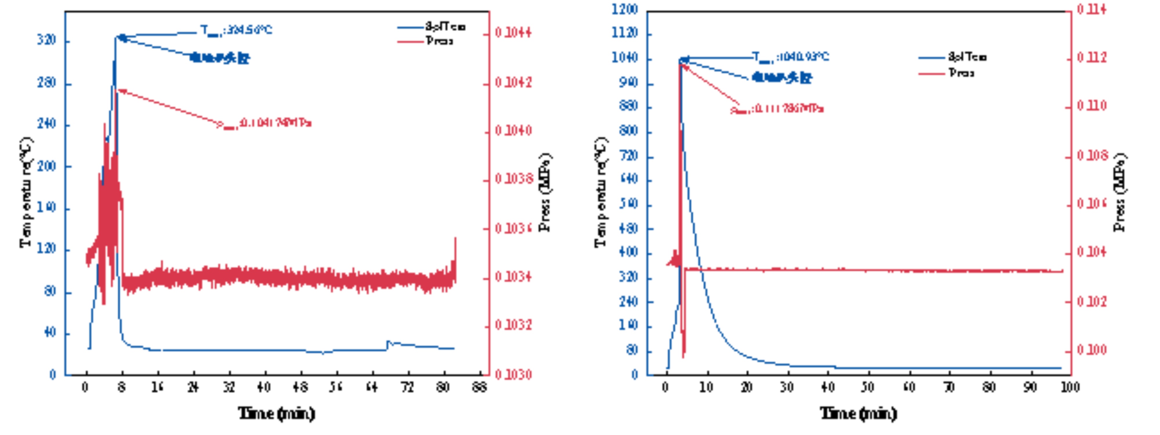 观察图4及图5,可以发现手机电池最高温度达到了1040℃,并且气体温度最高也升至400℃,压力上升了约7kPa。并且通过观察视频及对试验后防火砖的分析也可以发现整个热失控的过程十分剧烈,有明显的火焰燃烧现象发生。但对防火砖的进一步检测发现仅在外表面有污损,整体结构未见损坏。而对碱性电池的数据发现整个热失控过程都十分平缓,仅有大量白烟产生,实验室几乎无变化的防火砖也进一步验证了该实验结果。