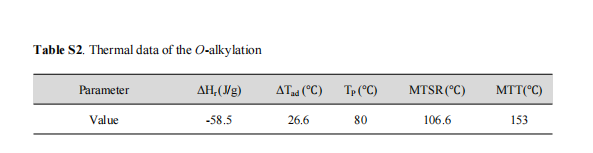 在O-烷基化反应中,研究团队采用RC HP-1000A自动反应量热仪测定了该反应的吸放热量、绝热温升(ΔTad)、过程控制温度(Tp)、失控最高温度(MTSR)、24小时最大反应速率到达时间对应的温度(TD24)及最高允许温度(MTT)等核心参数。结果表明,O-烷基化反应属于放热反应,其热风险等级判定为临界风险。